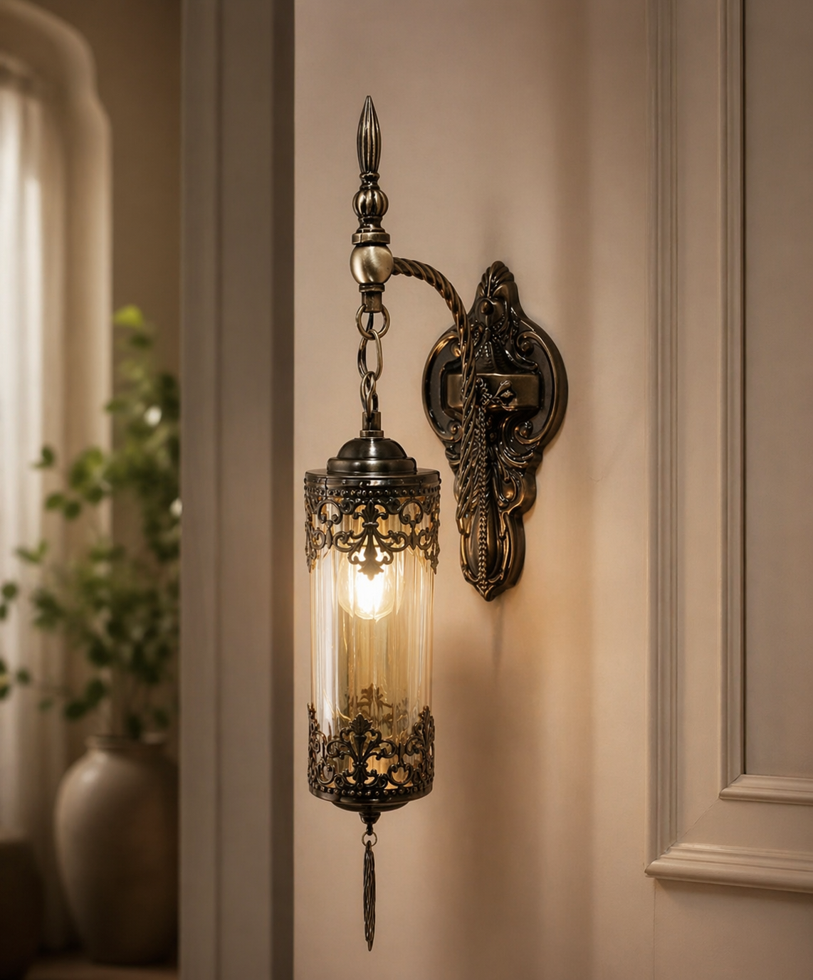 This wall-mounted hanging lantern features a beautifully carved antique bracket and a suspended cylindrical light. Designed for classic interiors, it provides a warm glow while adding architectural elegance to walls and corridors.