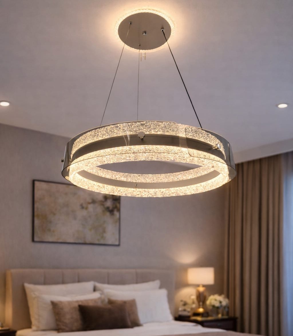 Bring a statement of elegance and ambient brilliance to your interiors with our Crystal Dual-Ring LED Chandelier. Designed for luxury bedrooms and modern interiors, this stunning piece features two concentric rings with embedded crystal-like detailing that disperses light beautifully, creating a warm and inviting atmosphere.
