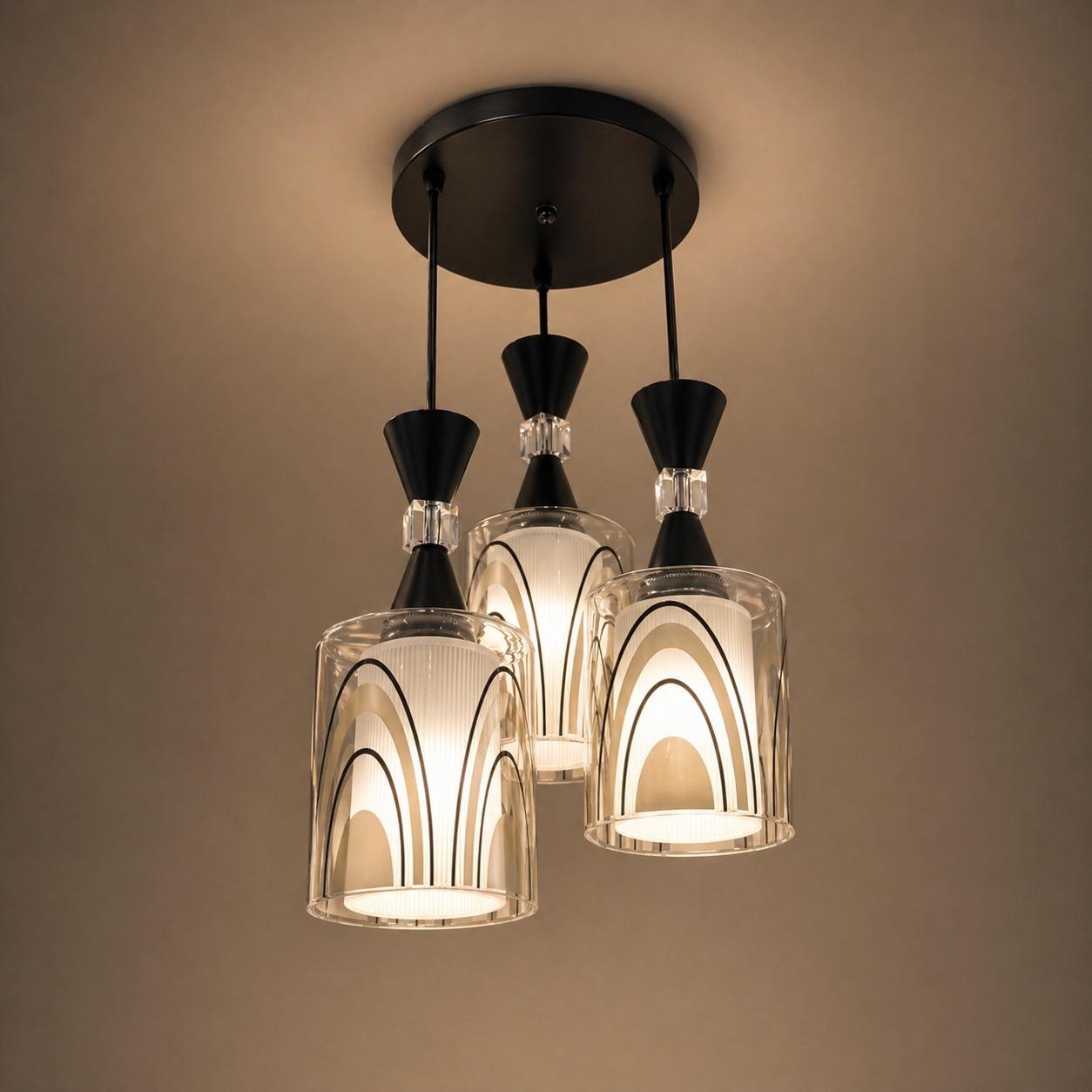 Each glass shade features a unique artistic pattern with layered arc designs that softly diffuse light, creating a warm and inviting ambience. The transparent outer glass combined with inner detailing enhances depth, making the fixture stand out even when not illuminated.