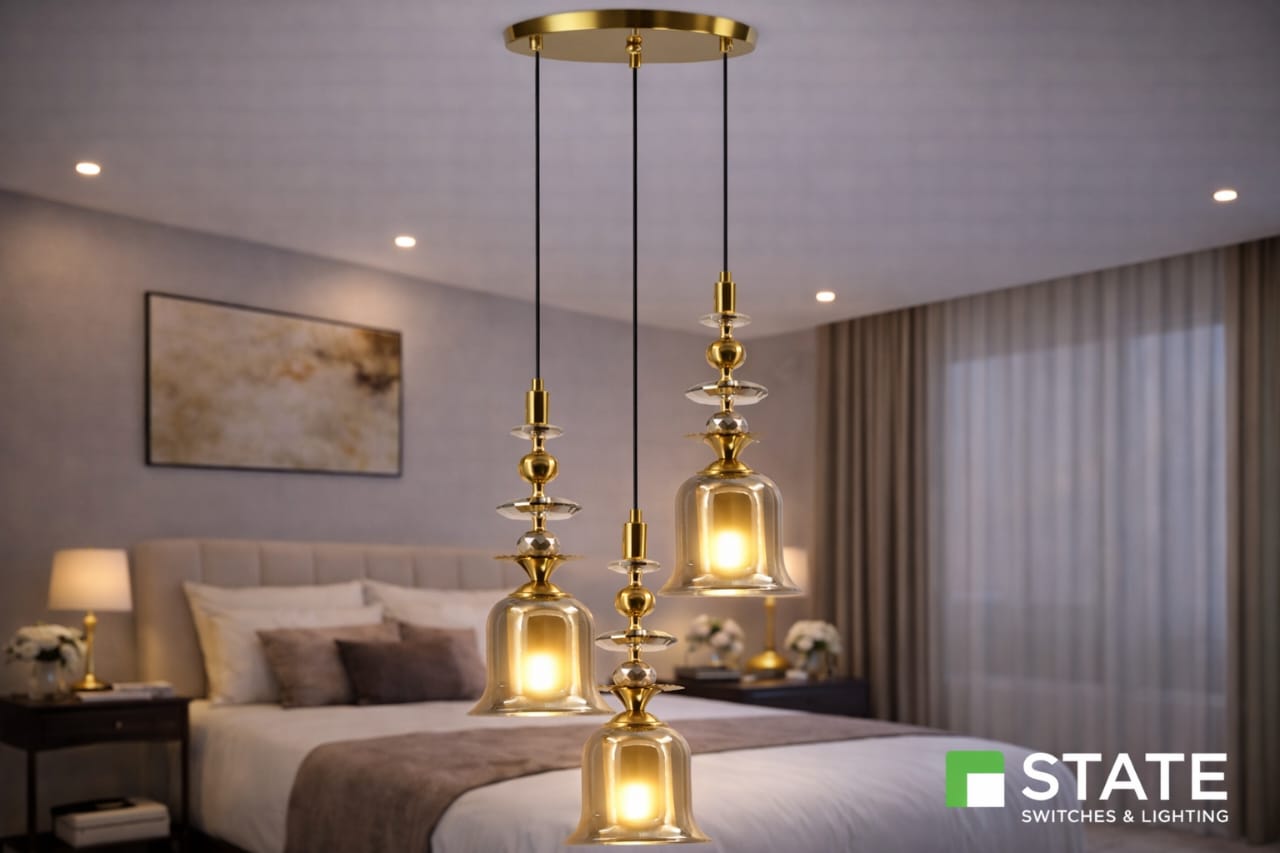 Elevate your interiors with this exquisite 3 Drop Pendant Light featuring premium golden bell-shaped glass shades with intricate crystal detailing. Designed to cast a warm, inviting glow, each drop hangs elegantly from a round golden ceiling plate, making it a statement piece for any contemporary or traditional bedroom setting. The handcrafted finishes, paired with energy-efficient lighting, offer both style and functionality. Ideal for bedrooms, lounges, or dining spaces seeking a royal touch.