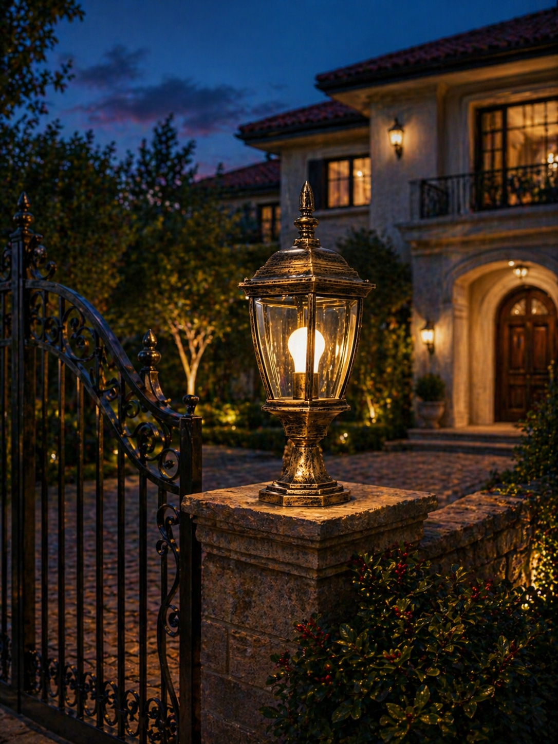 Inspired by classic European villas, this outdoor lantern combines artistic metalwork with a refined glass enclosure. The warm glow enhances stone textures and architectural details, creating a sophisticated outdoor ambiance.