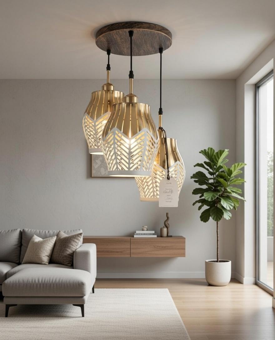 This pendant light features beautifully designed leaf-pattern cutwork with a rich golden finish. When illuminated, it casts soft artistic shadows, enhancing the ambiance of any modern interior. A perfect blend of nature-inspired design and luxury aesthetics.