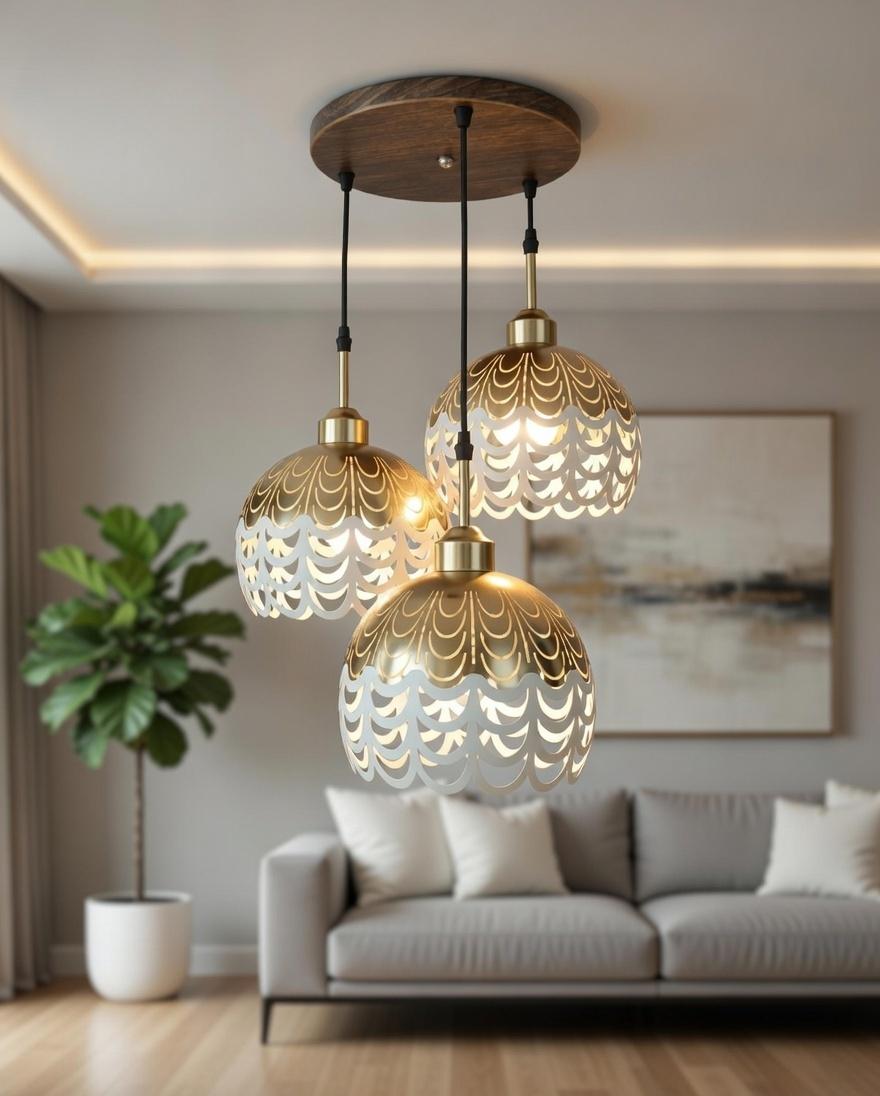This elegant pendant light showcases a unique wave-pattern design that creates a soft and artistic lighting effect. The golden finish enhances the warmth of the light, making it ideal for cozy and stylish interiors. Its triple hanging configuration ensures balanced illumination and a strong visual impact.