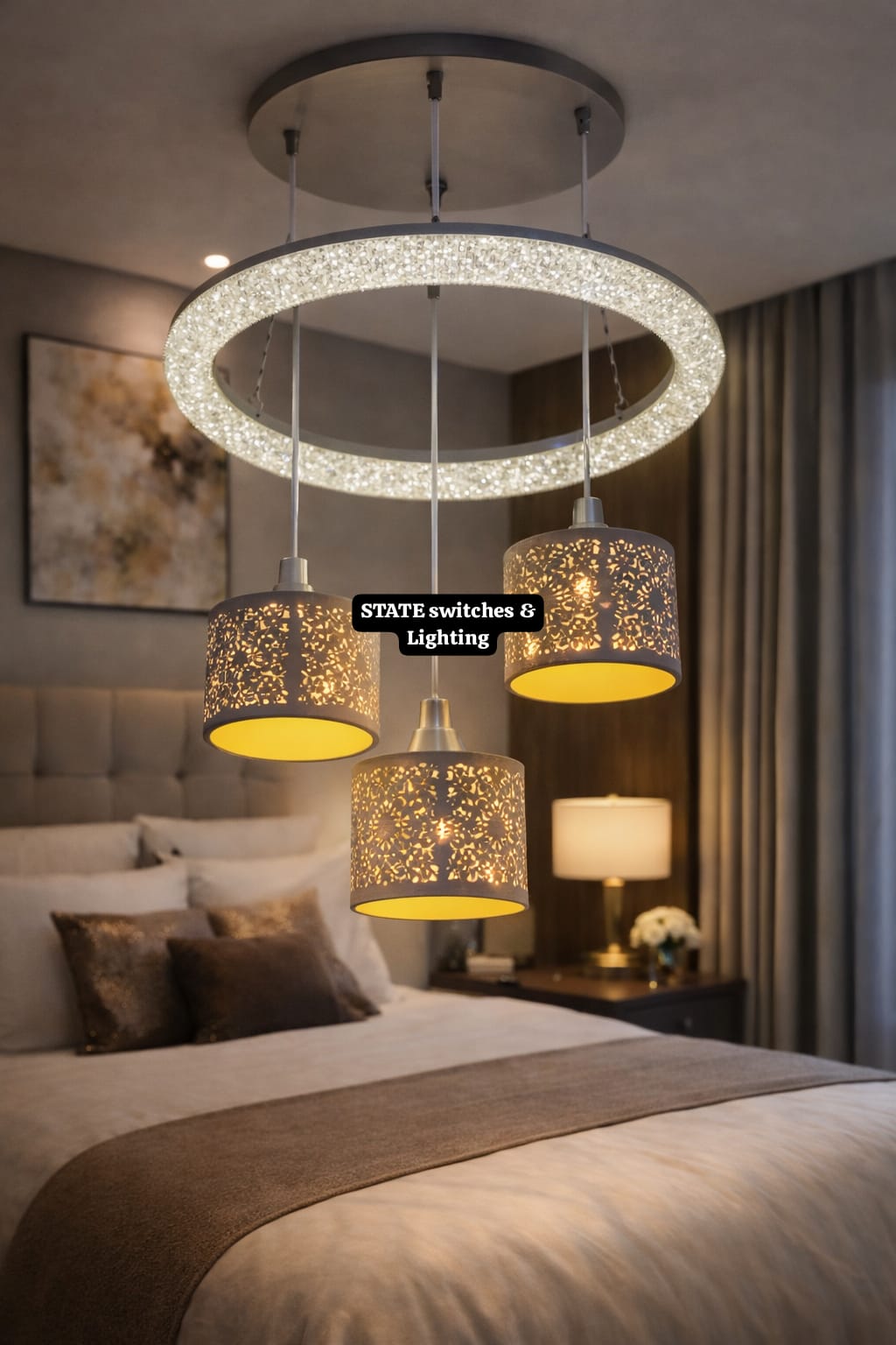 The Lumia 4-Drop Pendant Light offers a unique blend of elegance and ambient charm, combining modern luxury with intricate craftsmanship. Suspended from a crystal-studded halo ceiling plate, the four laser-cut drum shades emit a soft, inviting glow that elevates the atmosphere of any space. Designed for both contemporary and classic interiors, this piece makes a stunning statement in bedrooms, dining areas, or lounges. The warm light effect through the patterned shades adds a sophisticated yet cozy vibe to your decor.