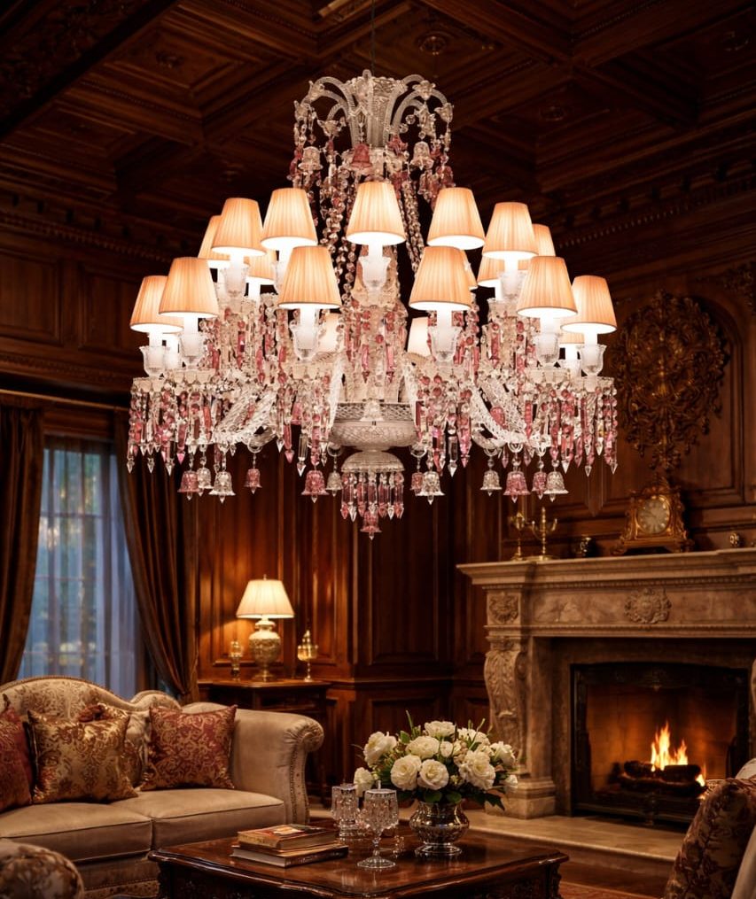 luxury chandelier, grand lighting, heritage décor, palace chandelier, multi arm chandelier, pink crystal chandelier, villa lighting, royal hall lighting, opulent ceiling light, chandelier with shades, antique interior lighting, timeless luxury light