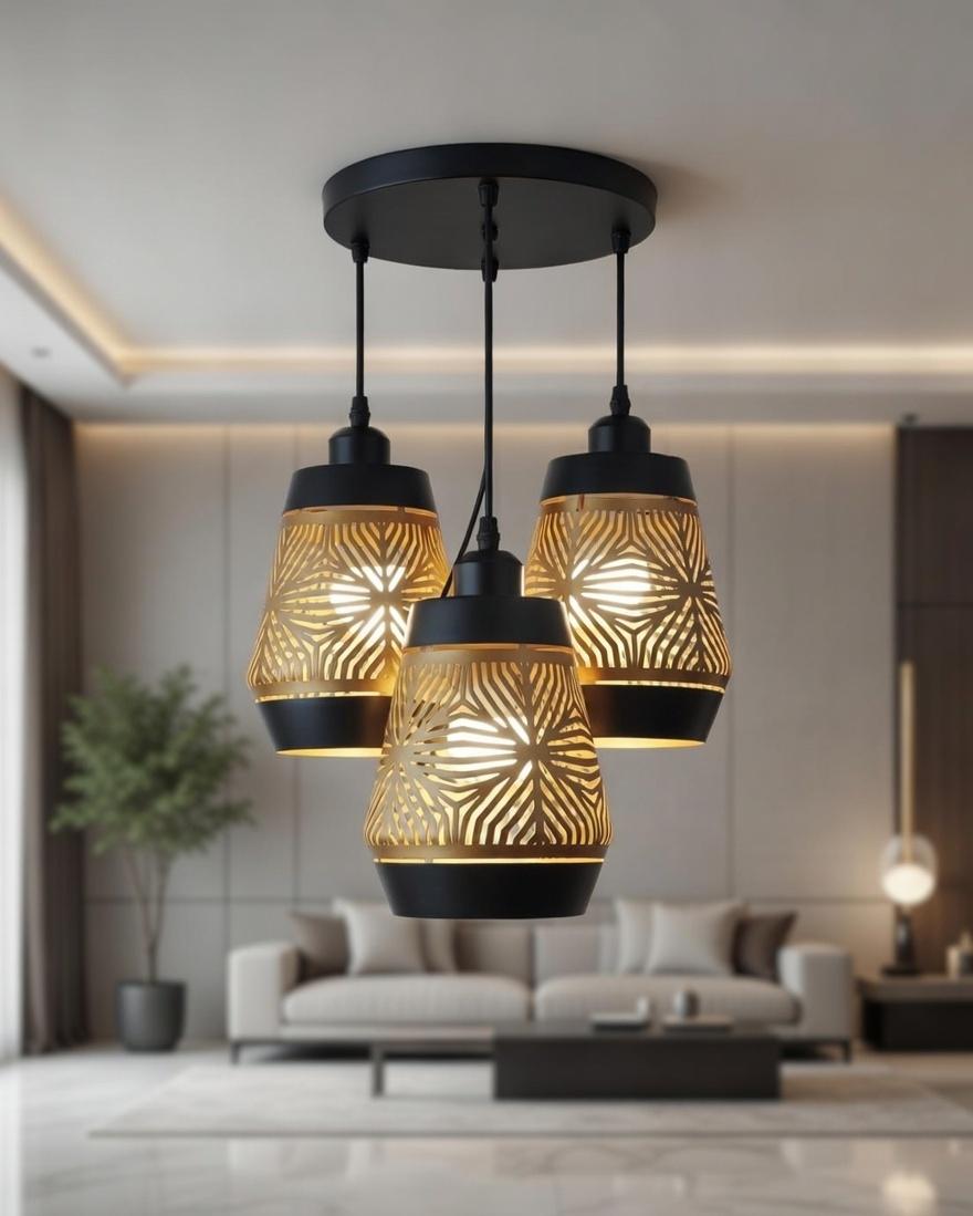 This designer pendant light features a detailed cutwork metal shade that allows warm light to pass through beautifully, creating artistic patterns across the space. The triple hanging structure adds depth and balance, making it ideal for modern living rooms and dining areas. Its matte black finish combined with warm illumination delivers a premium contemporary look.