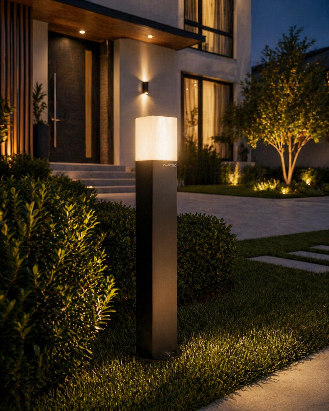 This modern bollard light features a tall, minimal structure with a top diffuser that emits soft, even light. It is designed to enhance pathways, gardens, and landscapes with a refined and contemporary appearance.