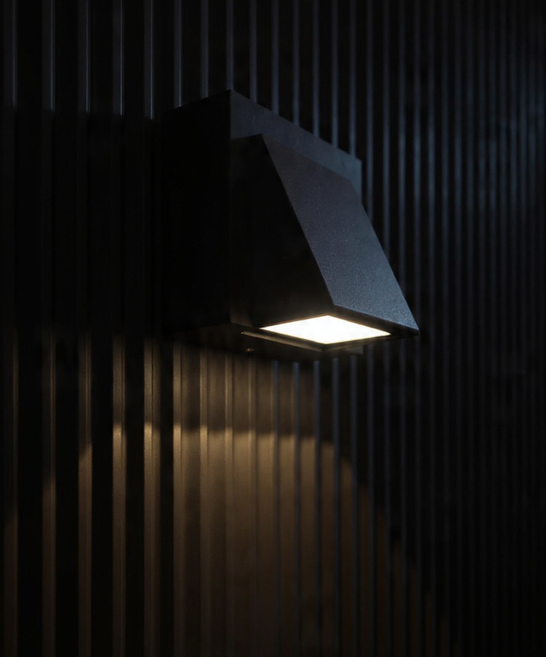 This geometric wall light features a bold angular structure designed for focused lighting. The sharp edges and clean lines give it a strong architectural presence, while the downward beam creates a precise and controlled lighting effect.