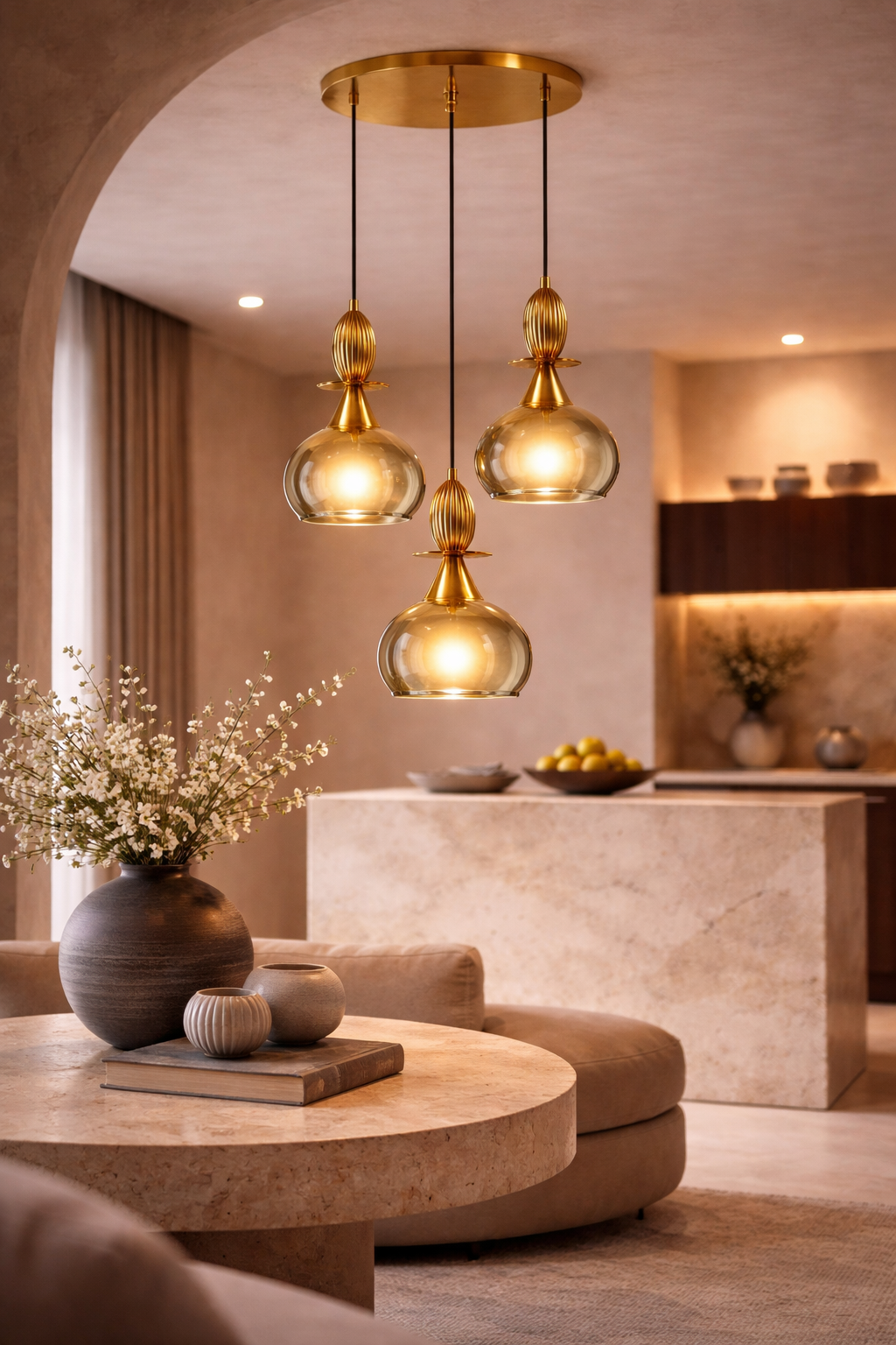 This triple pendant chandelier showcases beautifully curved bell-shaped glass shades paired with a polished gold framework. The warm filament glow creates a rich and inviting atmosphere, making it ideal for living rooms, lounges, and premium interiors. Designed to stand out without overwhelming the space, it delivers both aesthetic beauty and functional lighting.