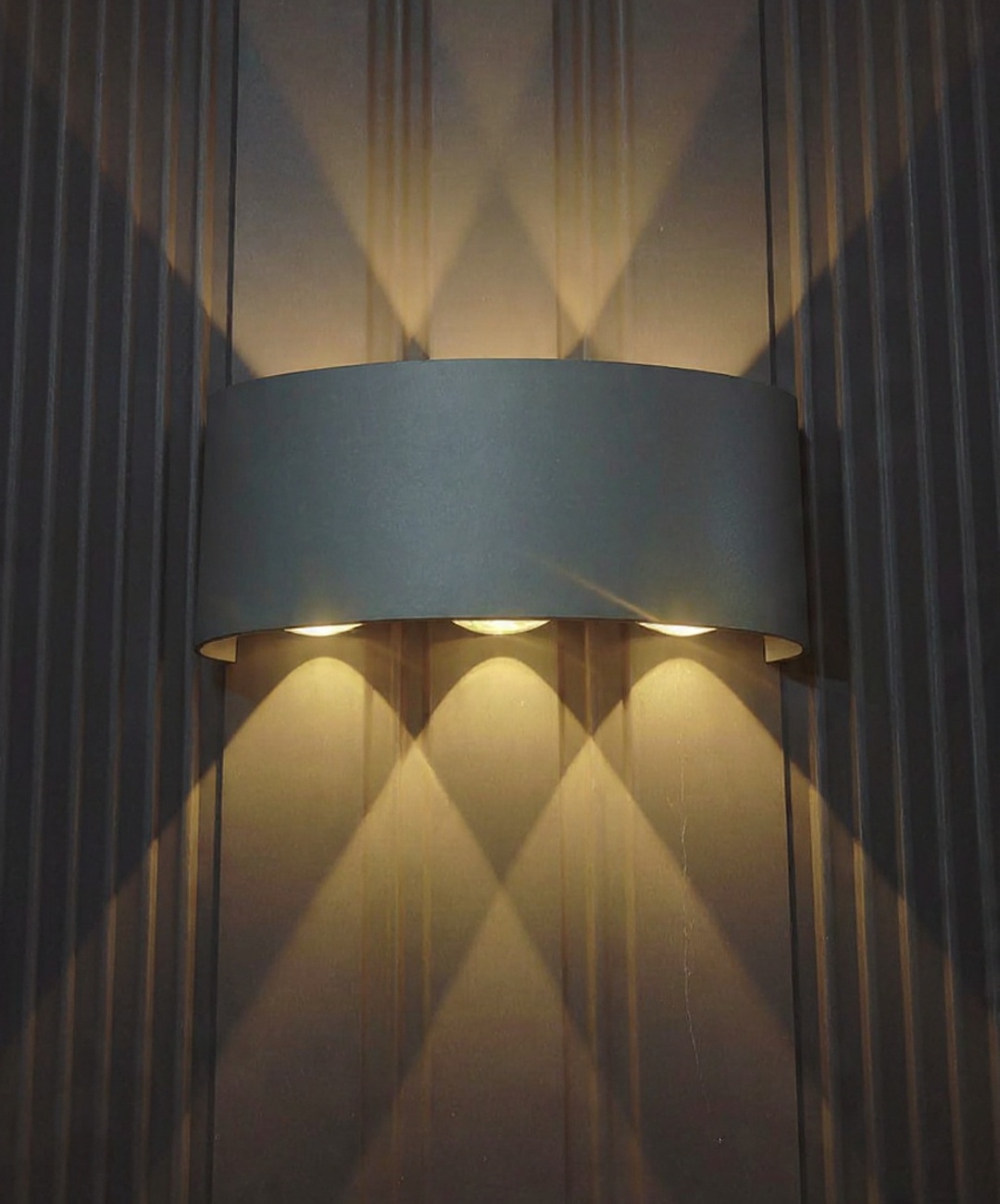 This modern linear wall light is designed to create a striking layered lighting effect with its triple beam output. The structured design allows light to flow through multiple openings, forming repeated symmetrical patterns that enhance vertical surfaces.