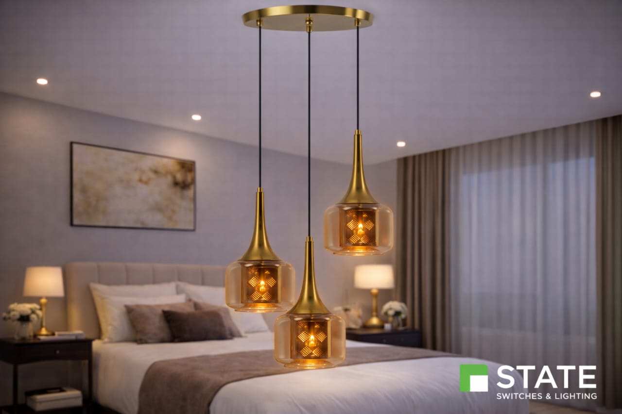 Add a golden glow of sophistication to your bedroom or living space with this beautifully crafted 3-drop pendant light. Featuring a brushed gold holder with teardrop design and amber-tinted glass shades, the fixture blends modern charm with vintage warmth. The gentle downward flow of light creates a cozy ambiance ideal for bedrooms, lounges, or boutique hotel suites.