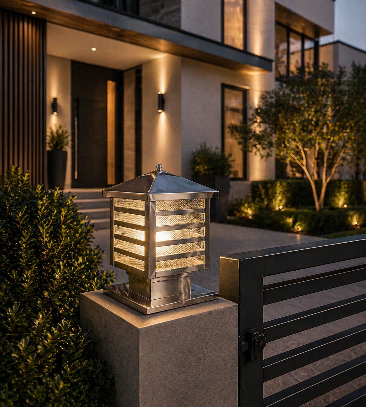 This modern pillar light features a sleek stainless steel body combined with layered glass panels that create a uniform and attractive lighting effect. The structured design enhances both durability and visual appeal.