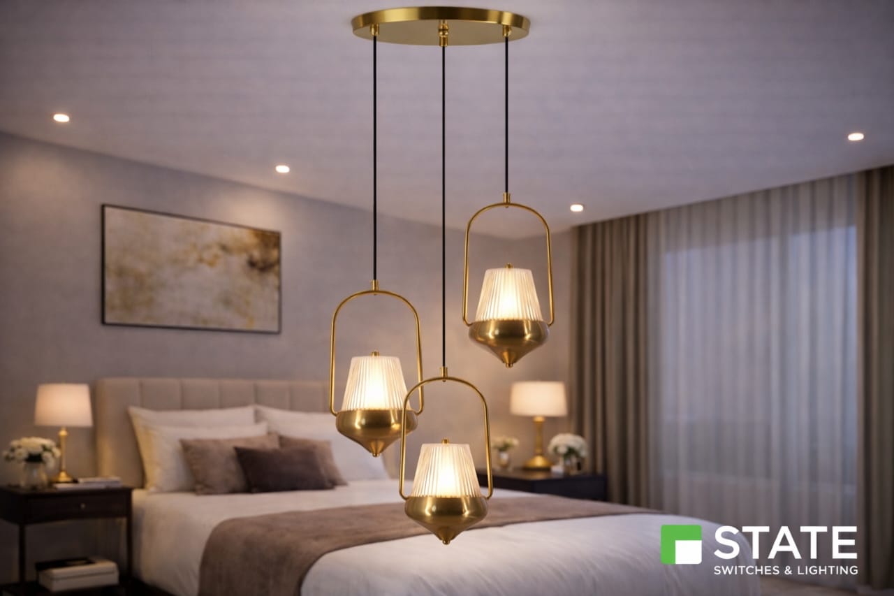 pendantlight modernlighting bedroomdecor vintagecharm interiorstyle goldlighting warmambience luxuryhomes 3droplight frostedglass lightinginspiration statelighting